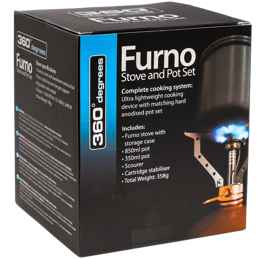An 850ml pot, and a mug/bowl that doubles as a lid, comes complete with the 360 Degrees Furno Stove, a lightweight, high-performance hiking stove.