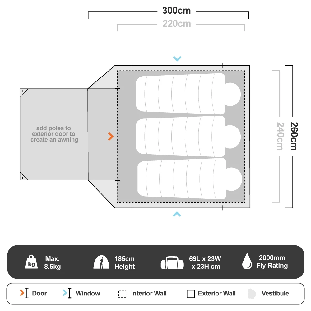 The advanced steel and fibreglass pole design offers 50% more space than traditional fibreglass pole tents, with excellent headroom and space to move. Let’s talk about that ‘hybrid’ frame design: the straight wall frame consists of steel poles that not only allow more room to move, but add stiffness and strength against high winds in comparison to traditional tents. Easy to slot together, they contribute to a more intuitive tent frame than the sometimes-convoluted and complicated series of sleeves and slots in traditional dome tents. Curved fibreglass poles in the roof both give the frame room to flex and provide that unique head height that this tewnt style is known for. Two-to-one guy ropes make pegging down speedier, and ensure a sturdier, more stable setup.