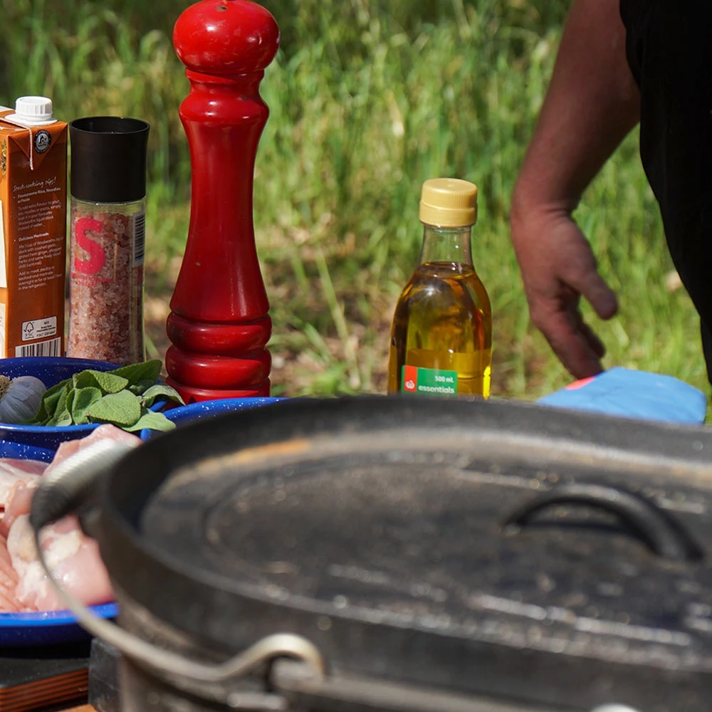 Made with solid pre-seasoned cast iron and featuring a flanged lid to keep coals on top, and twin spiral carry handles that makes carrying a full camp oven comfortable.