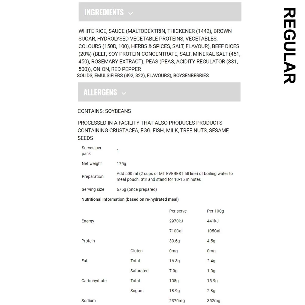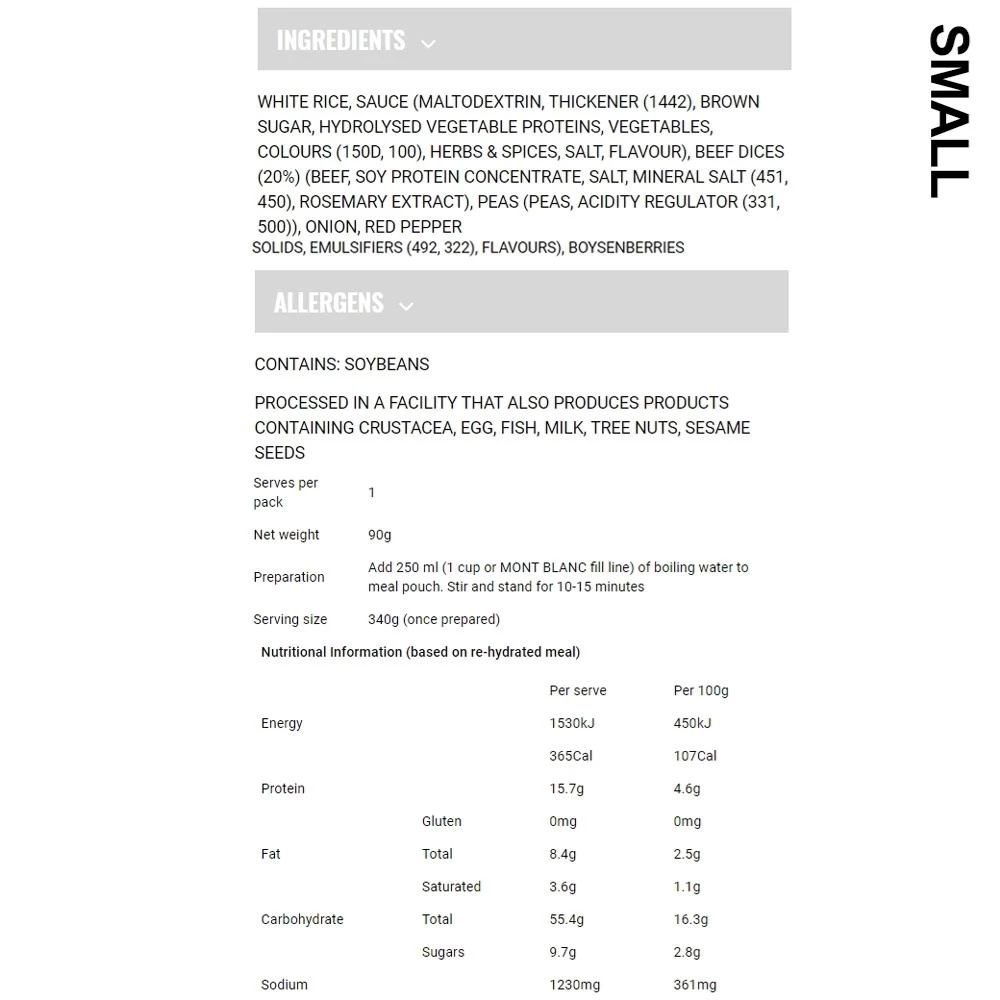 - Ingredients: Rice, Sauce [Maltodextrin (Maize), Thickener (1442), Sugar, Hydrolysed Vegetable Proteins (Maize, Soy), Dehydrated Vegetables (Onion, Garlic), Herbs & Spices (Cumin, Cilantro), Colours (150d, 100)], Beef 20% [Beef, Salt, Soy Protein, Stabilizer (450, 451), Hydrolysed Vegetable Protein], Peas, Onion, Red Pepper