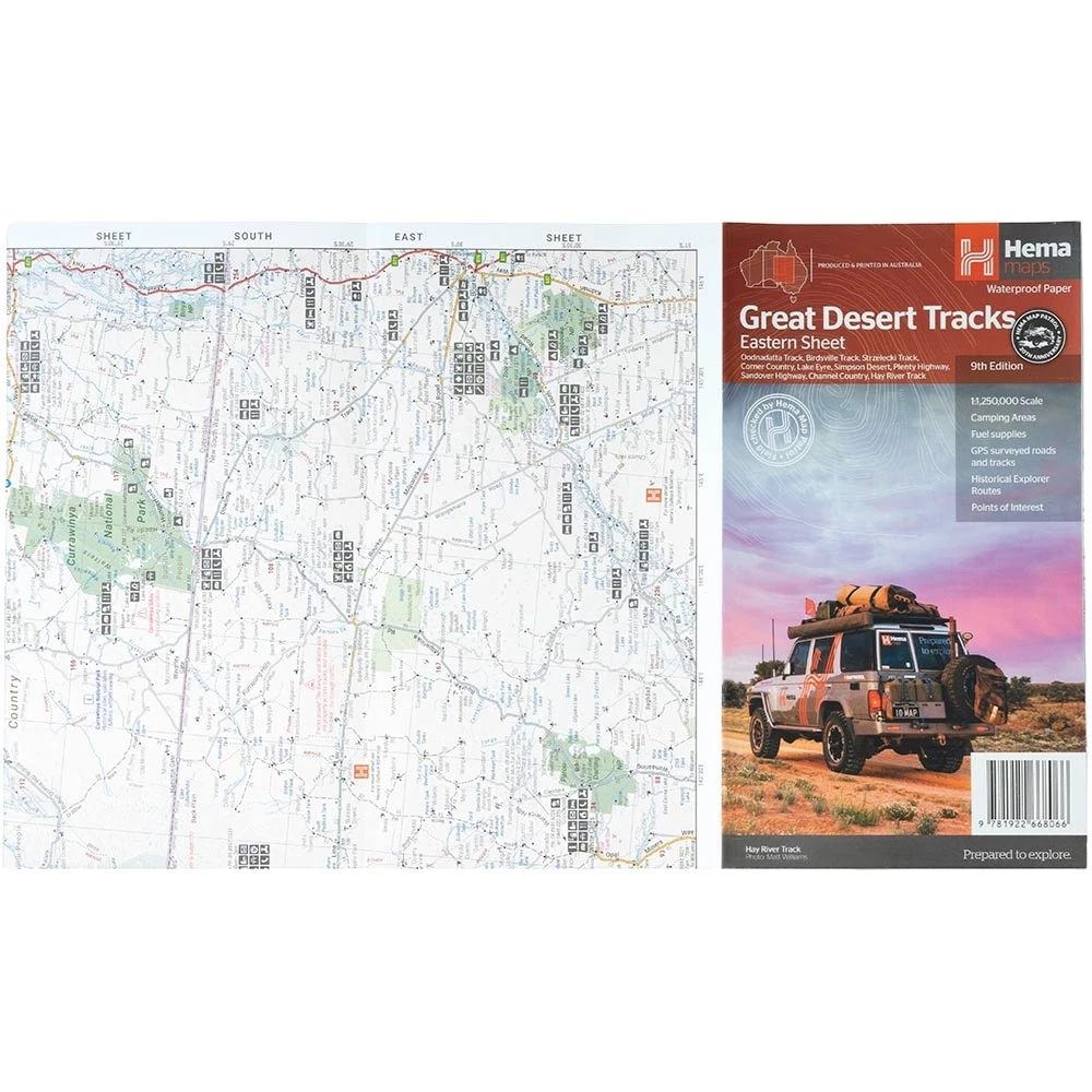 Constructed with waterproof paper for durability, the Hema Great Desert Tracks Eastern Sheet 9th Edition Guidebook also details contact information, desert-travel considerations, and the recommended camping clobber for your rustic road trip.
