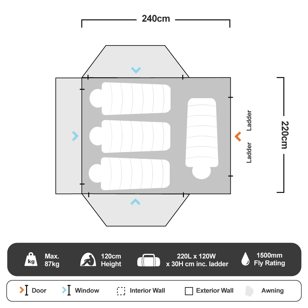 This RTT made from fully seam sealed 260sgm polyester/cotton ripstop canvas for durability on your expeditions, with a sturdy internal aluminium frame for structure. With two entry points and telescopic alloy ladders, you can access this shelter easily, and it has an adjustable tropical fly to help prevent condensation. Check out the heavens through the two star gazing windows, keep out insects while enjoying the scenery from the large full-width side windows, and get fresh air through the built-in air vents.