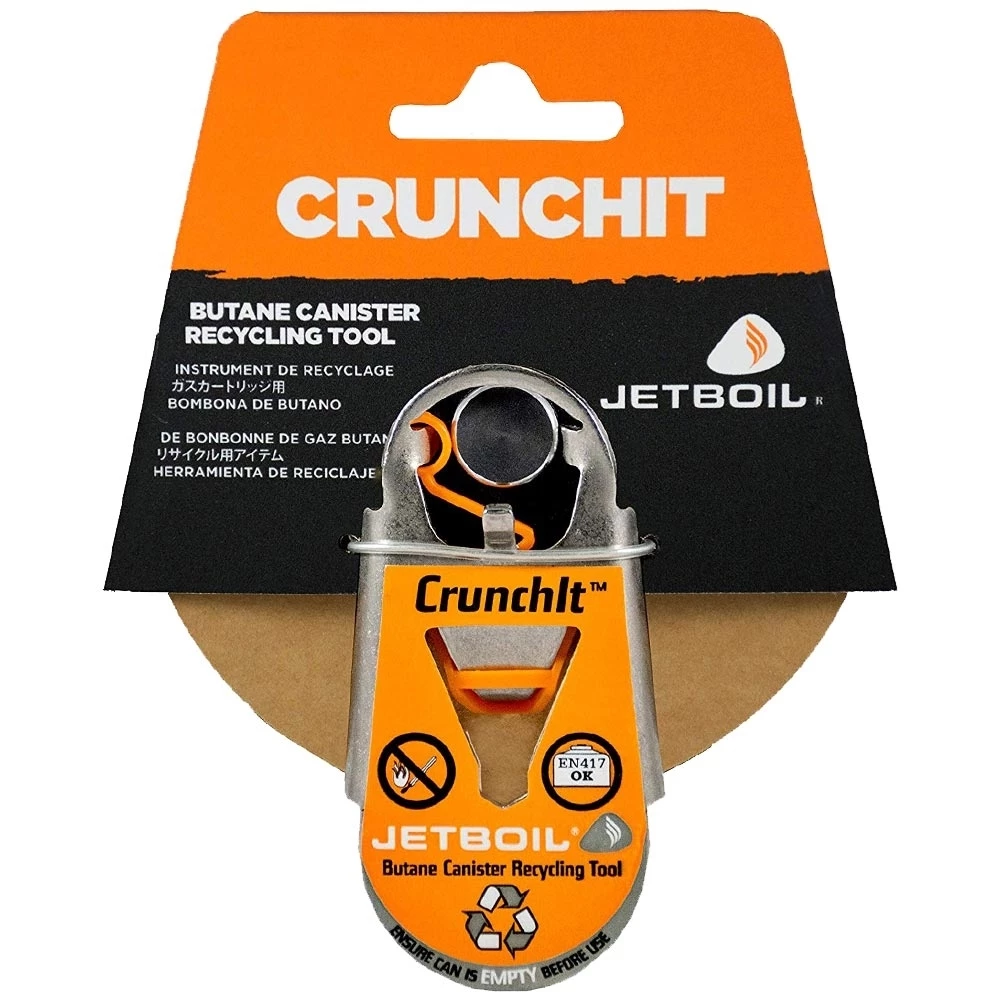 You can safely put your empty gas canister directly into your recycling bin at home, with help from the CrunchIt tool from JetBoil.