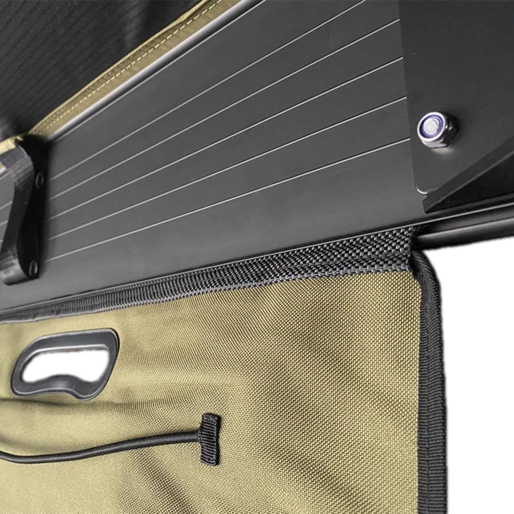 This sling is constructed from PVC laminated 900D polyester oxford and features a durable 600gsm dimple PVC backing. Pack up 4 mugs, 2 wine glasses, and 6 plates and bowls into the main hanger. Stash cutlery into a separate hanger, boasting 14 pockets and 2 knife holders that can be stowed in the Sling’s main pocket. With the option to hang your tea towel or paper towel for easy access while you cook, packing the hangers is a breeze with quick-release buckles and carry handle. Easily suspend from any roof top tent or awning with a sail track, owed to the 8mm Kedar rope tape that slides straight on.