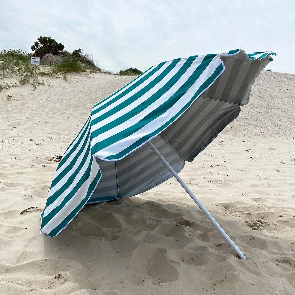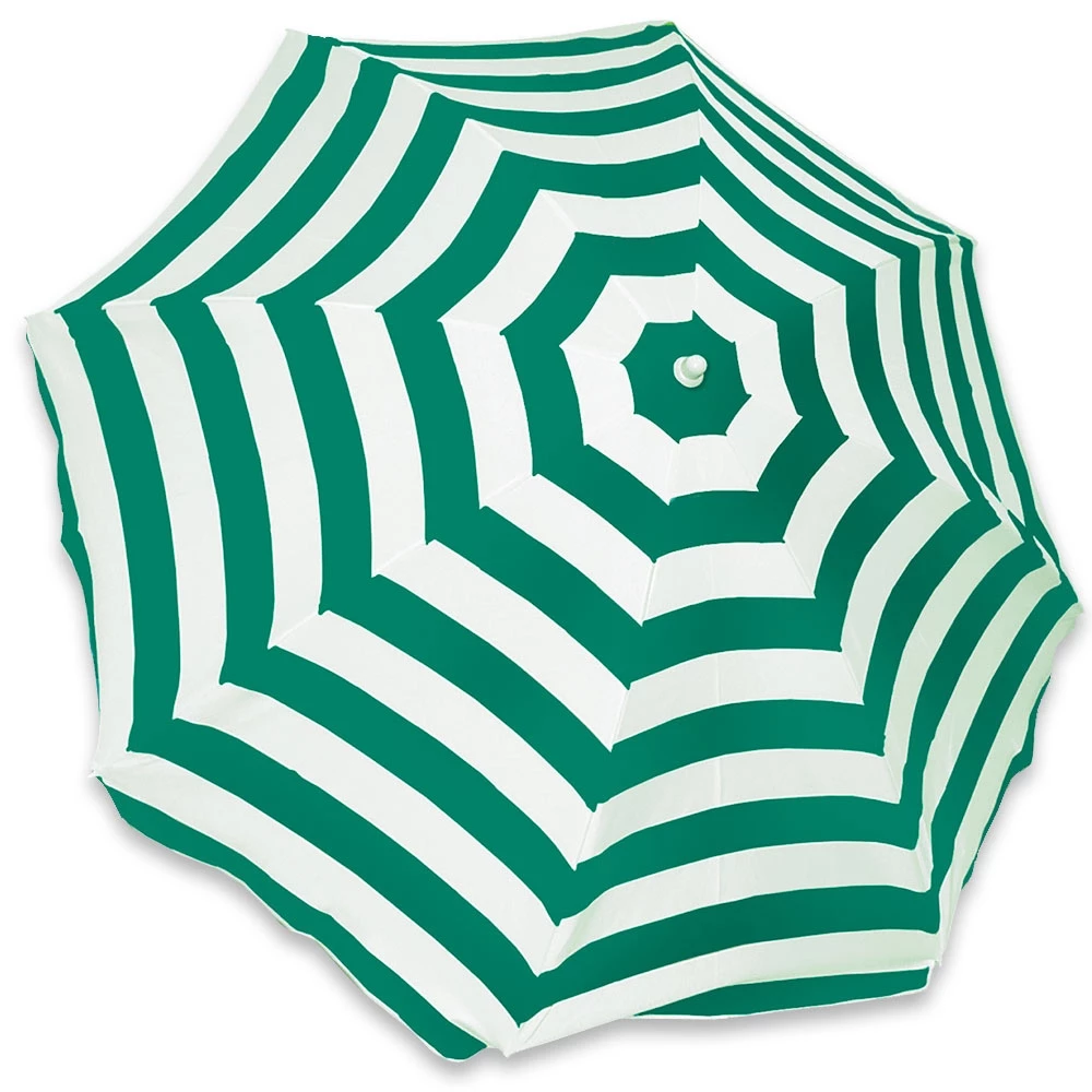 Embrace bay life thanks to its screw-in base for security on the sand and soft surfaces, supporting a robust steel frame for a sturdy seaside setup. Draped on top is a smart green and white printed canopy, silver-lined for further protection from the sun. Plus, enjoy convenient transport from the back seat to the beach thanks to the carry bag with shoulder strap.