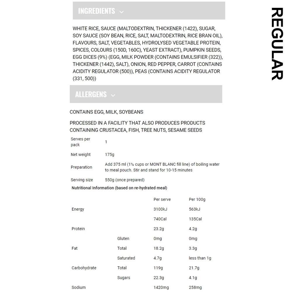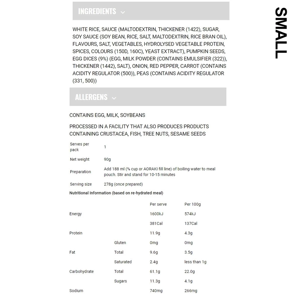 - Ingredients: Brown Rice, Sauce [Thickener (1442), Maltodextrin (Maize), Sugar, Dehydrated Vegetables (Onion, Garlic, Mushroom, Celery), Soy Sauce (Soy Bean, Rice, Salt, Water, Ricebran Oil), Salt, Hydrolysed Vegetable Proteins (Maize, Soy), Spices, Flavours, Colours (150d, 160c), Yeast Extract, Mustard], Pumpkin Seeds, Egg [Pasteurised Egg, Milk Powder, Salt, Thickener (1442), Yeast Extract], Peas, Canola Oil, Carrots, Onion, Red Pepper