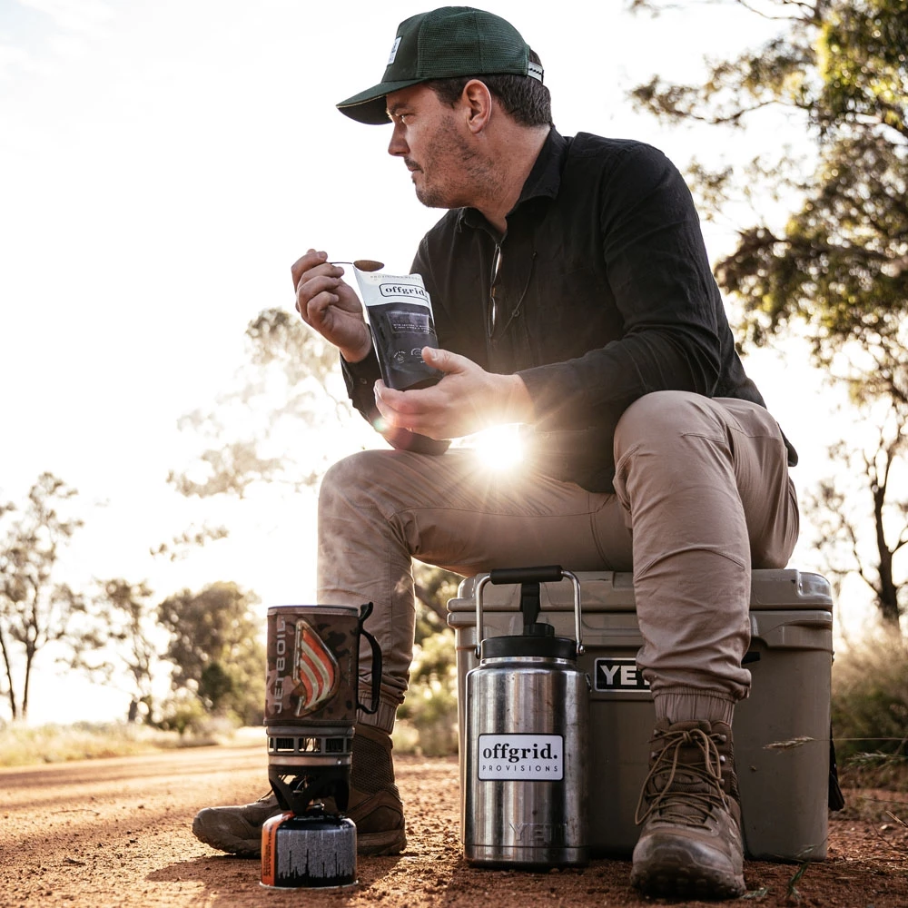 All-natural, Aussie-made, and designed to heat and eat for simple, alfresco-style sustenance – this curry champions wild goat and brings it home with a tangy tomato, ginger zing, and a smack of spice. Be you crouched at the campfire or behind the kitchen bench – simply drop into a Billy (goat) of boiling water for five minutes, or tear at the top and microwave.