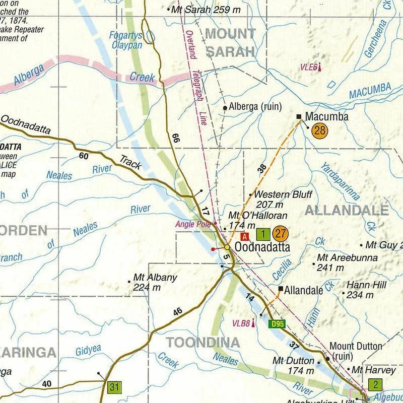 This map highlights all the fine details you need to enjoy a safe trip along the Oodnadatta track and not miss any of the highlights along the way. It is clear and easy to read and caters to the needs of travellers in 4WD’s as well as towing caravans.