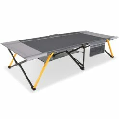 Tall campers can rejoice as this stretcher doesn’t have head or foot cross bars, so you won’t have a metal pole digging into while you sleep. This stretcher is also a good option if your back needs a firm surface, as it’s fully flat with a soft touch fabric top. The durable powder coated frame will keep you sleeping solidly all night and can easily be wiped if it gets a little grubby with use.