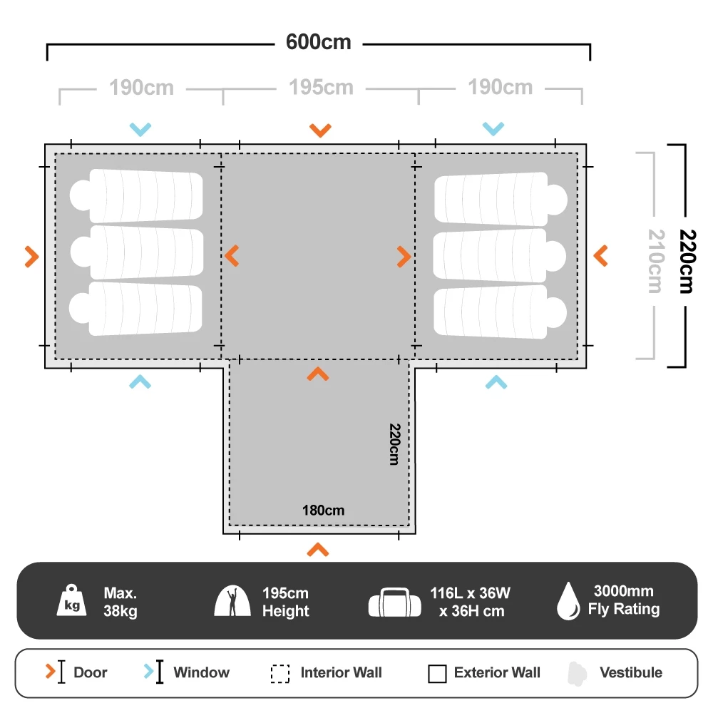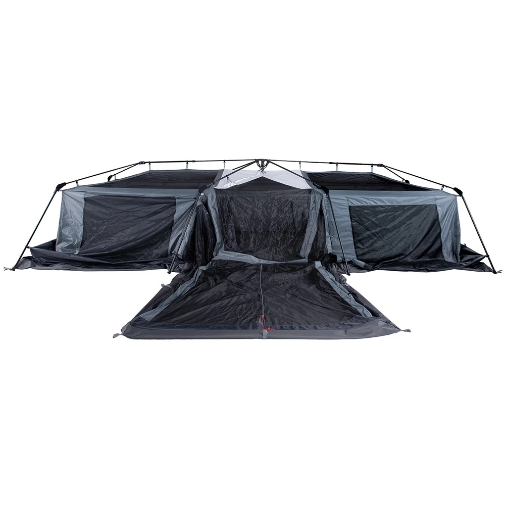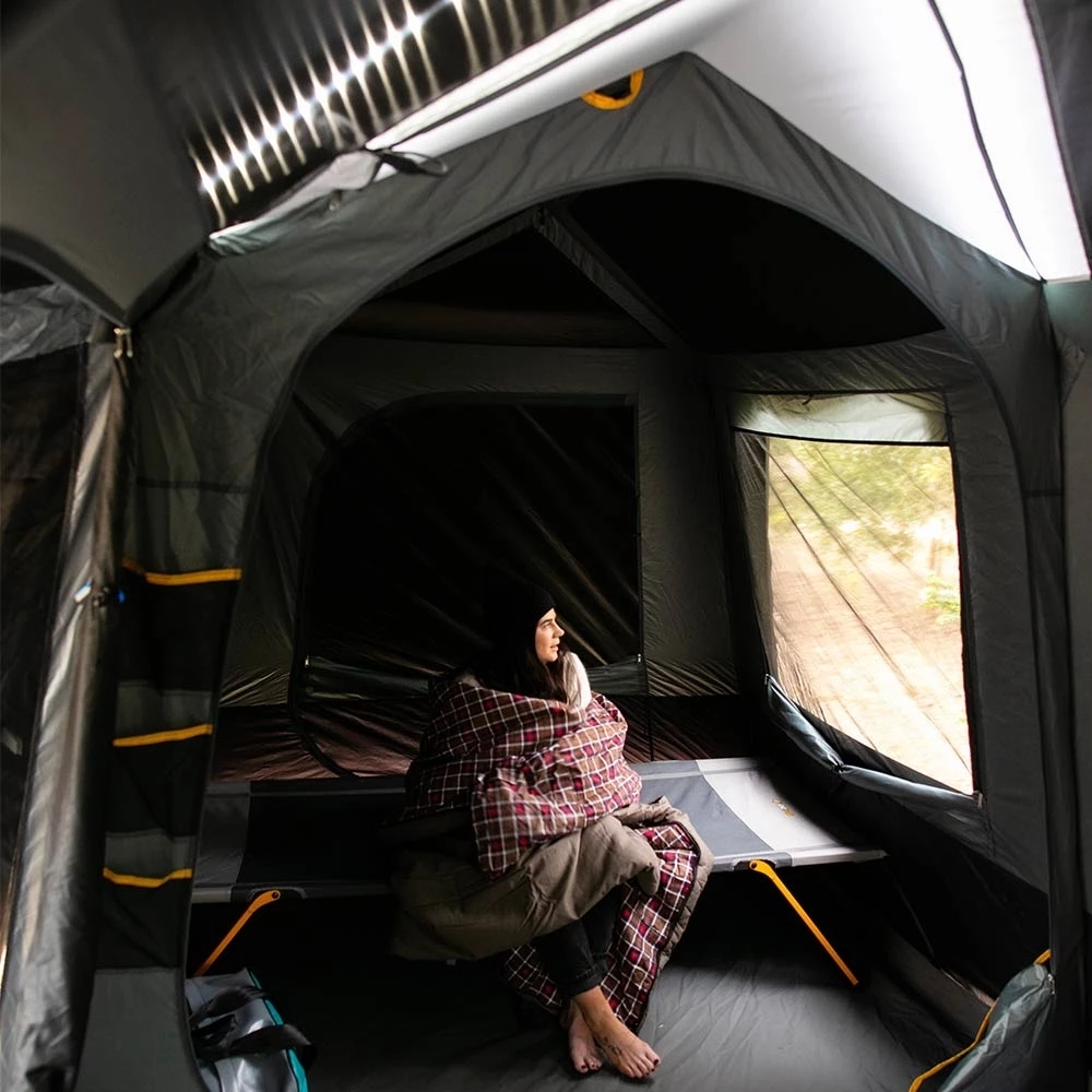 The Triple Hub Frame system sets up in minutes and allows a 4-room configuration, each with a zippered internal divider for privacy. The bedrooms provide enough space for stretchers and queen-sized airbeds and with large front, rear and side doors there’s easy access for everyone. ClimaTech vents and No-See-Um Mesh panels will keep the bugs out and the air circulating so you’ll have maximum comfort even in warm conditions. BlockOut Technology on the fly will also help reduce heat by 10° as well as cutting the daylight so you can keep on sleeping. And let’s not forget the name – Lumos. A trademarked LED lighting system that’s built into the Fast Frame with flexible settings so that you can control the illumination.