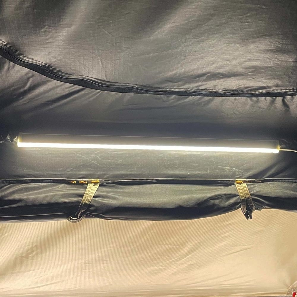 Power up with T-slot racks that enable solar panel mounting – and turn it on when off the grid, with LED strip lighting featuring USB plugs and storage pockets for power packs (not included). Keep the tackle together in the internal storage pockets and your kicks from heading up sticks with external shoe pockets. Your sleep setup can remain stowed and secured in the tent to maximise the storage space in your vehicle. Built in elastic shock bands make it easy to pack flat without the excess flap.