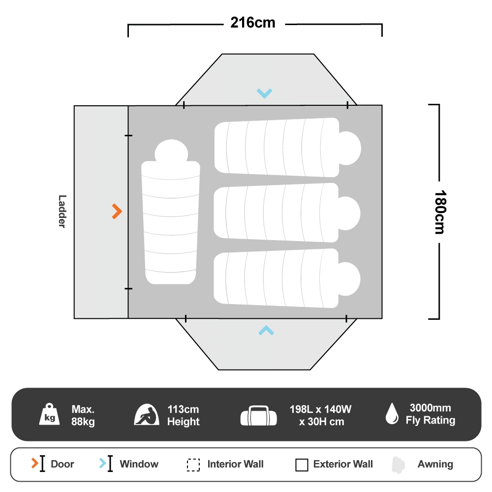 - Fly sheet provides weather protection over entrance and ladder