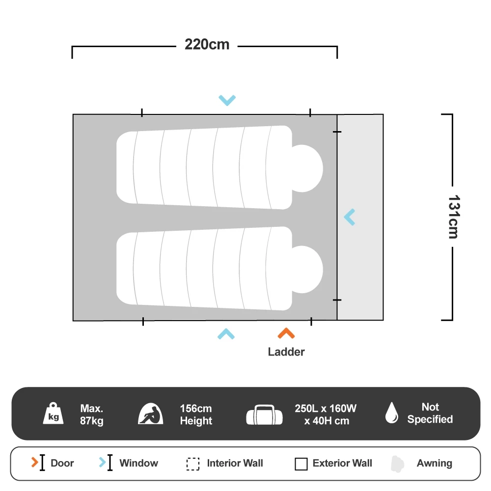 This design will give you a secure place to sleep, just open the latch and the gas strut assisted aluminium hull to reveal the tent. Inside there’s an 80mm rebound foam mattress, a 20mm padded anti-condensation mat to keep moisture at bay, and space to leave your sleeping bag and blankets inside when it’s packed up. Keep your phone and other smaller essentials close by as you sleep in the 2 large built-in storage pockets, or other gear in the 6 removable storage pockets that include a media device viewing sleeve and drink holders. Constructed from LST coated canvas, this treatment will defuse sunlight while keeping UV rays from getting inside your tent for more comfort, and there are 3 screened entries/exits for ventilation and easy access.