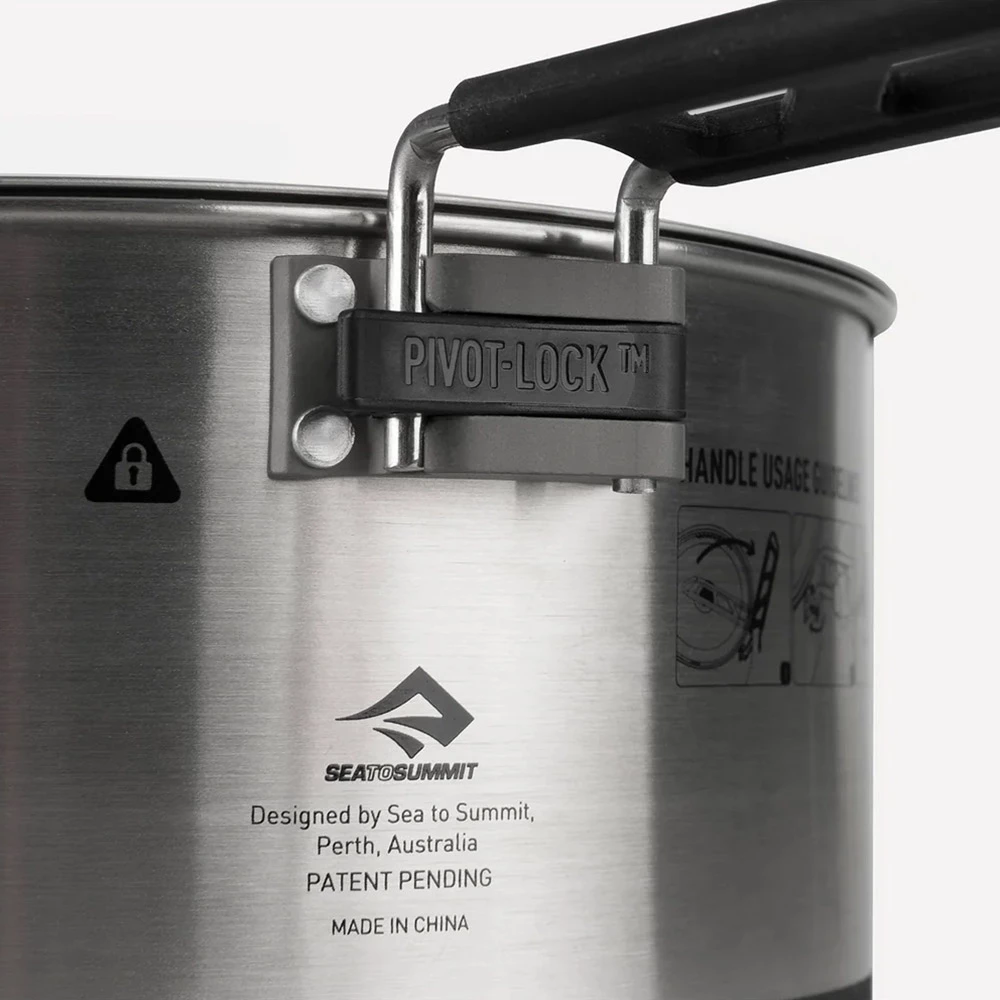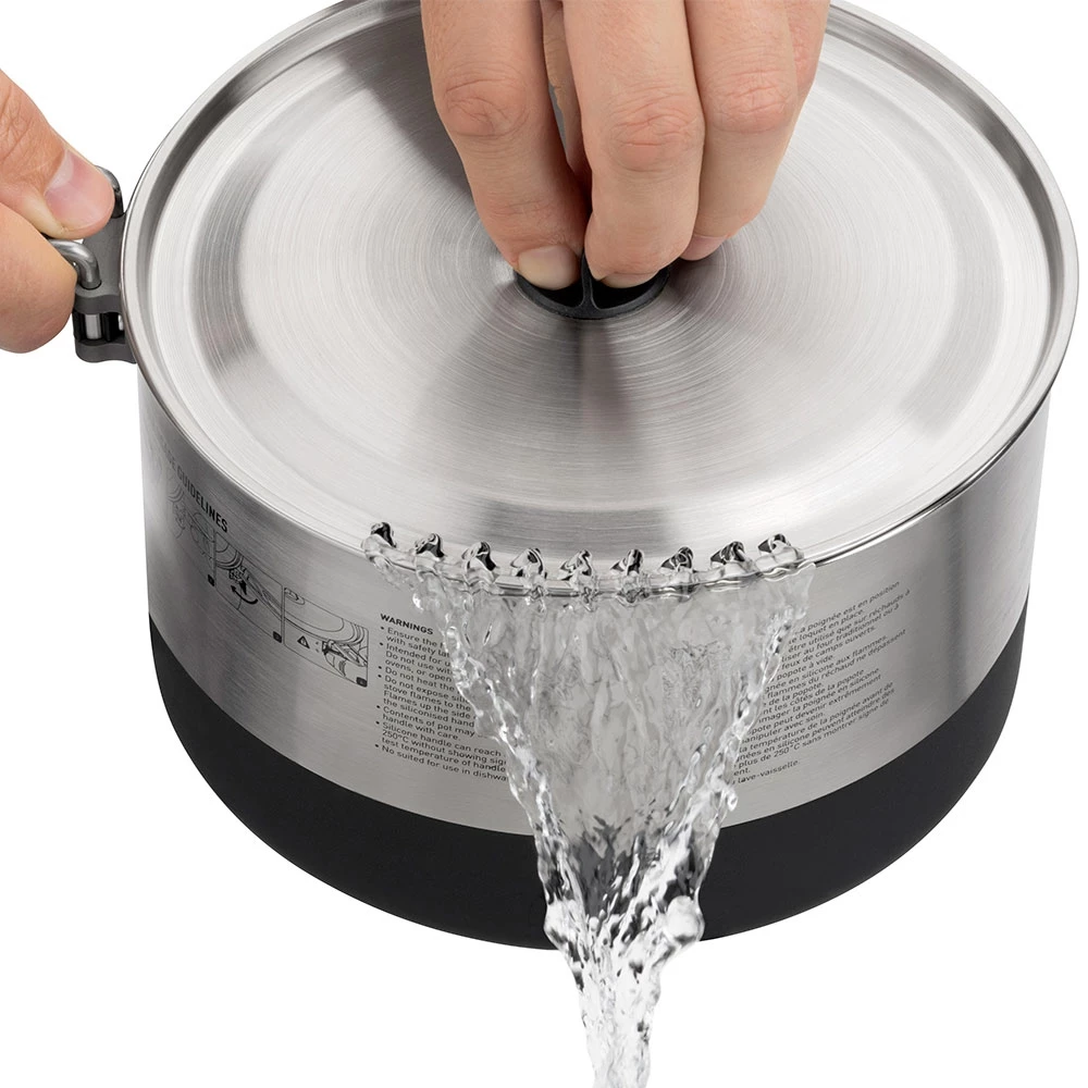 The pot is constructed from marine-grade stainless steel with a grippy black base to absorb heat and prevent slippage on a stovetop. Its Pivot-Lock handle stays secure when in use and locks away safely for transport. Drain pasta or vegetables thanks to the strainer incorporated into the lid, and achieve precise measurements with the graded scale on the side. When cooking, simply rest the lid on the side of the pot thanks to the clever silicone LidKeep feature, while a large interior has it easy to clean.