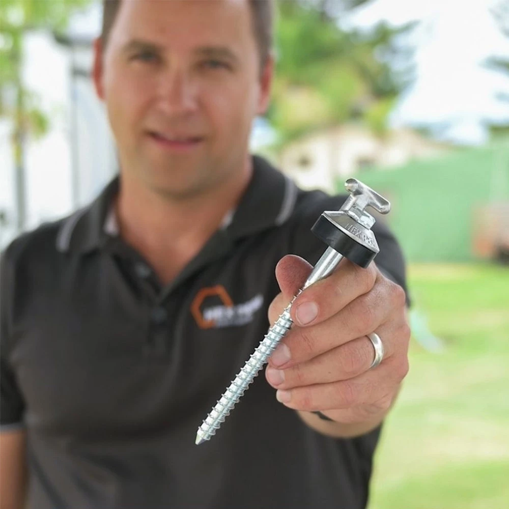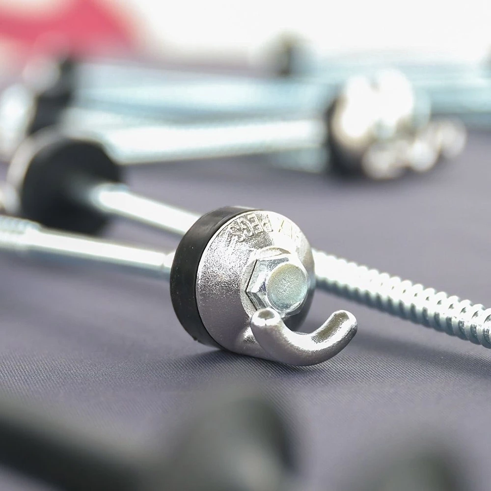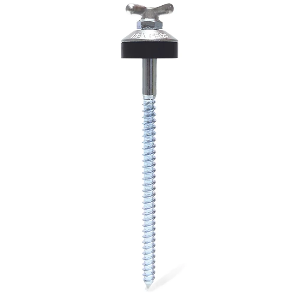 Made from the same high-quality steel as the original Hook Peg, these shorter ones have been designed for those times when you drill into super hard ground but you just can’t get a long one all the way in. With a shaft diameter of 10mm and a total length of 172mm, these pegs can be used with most types of drill or impact drivers. The hook attachment is securely welded to the stainless-steel washer and allows you to secure your guy ropes with ease. This top area is protected by the rubber grommet and the threaded body ensures your peg will stay in place the way you need.