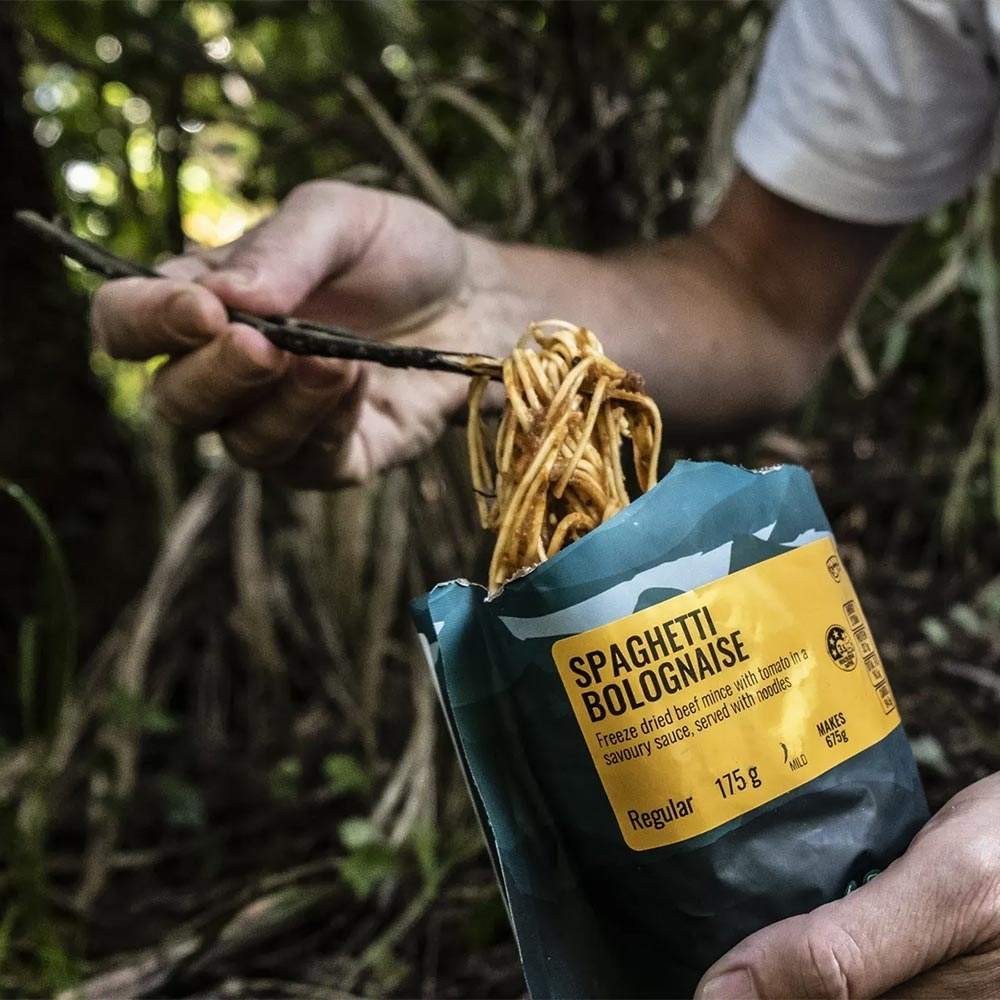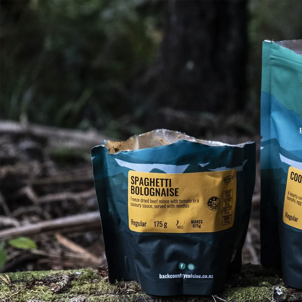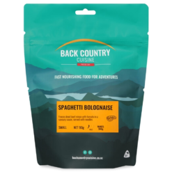 The Back Country Cuisine Spaghetti Bolognaise is comprised of tender beef mince with tomato in a savoury sauce served on a bed of noodles for a hearty meal on a lightweight adventure.