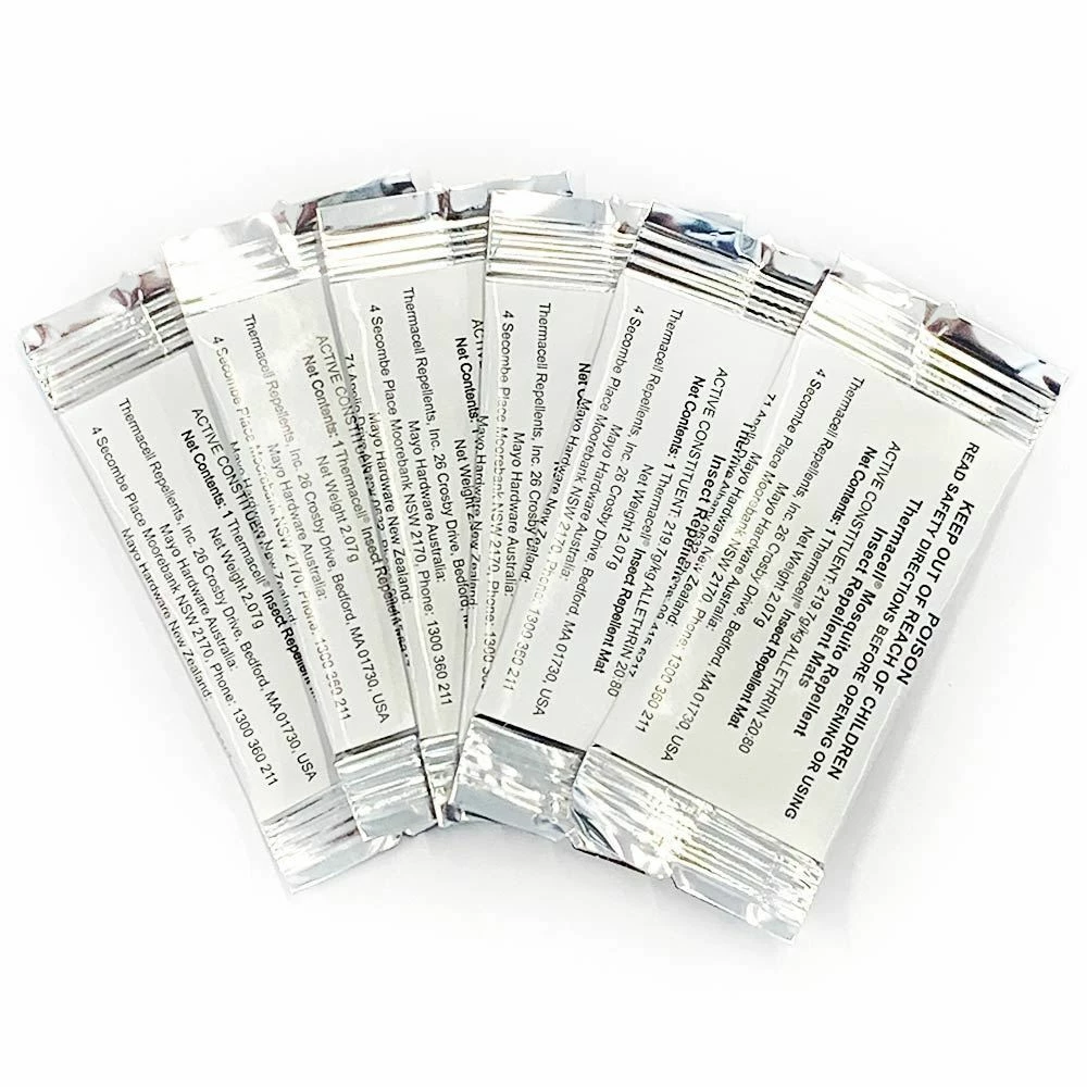 These mats are compatible with all of the Thermacell appliances and lanterns, each mat lasts for up to 4 hours of use, and contains a repellant called allethrin which is a synthetic extract from the chrysanthemum flower.