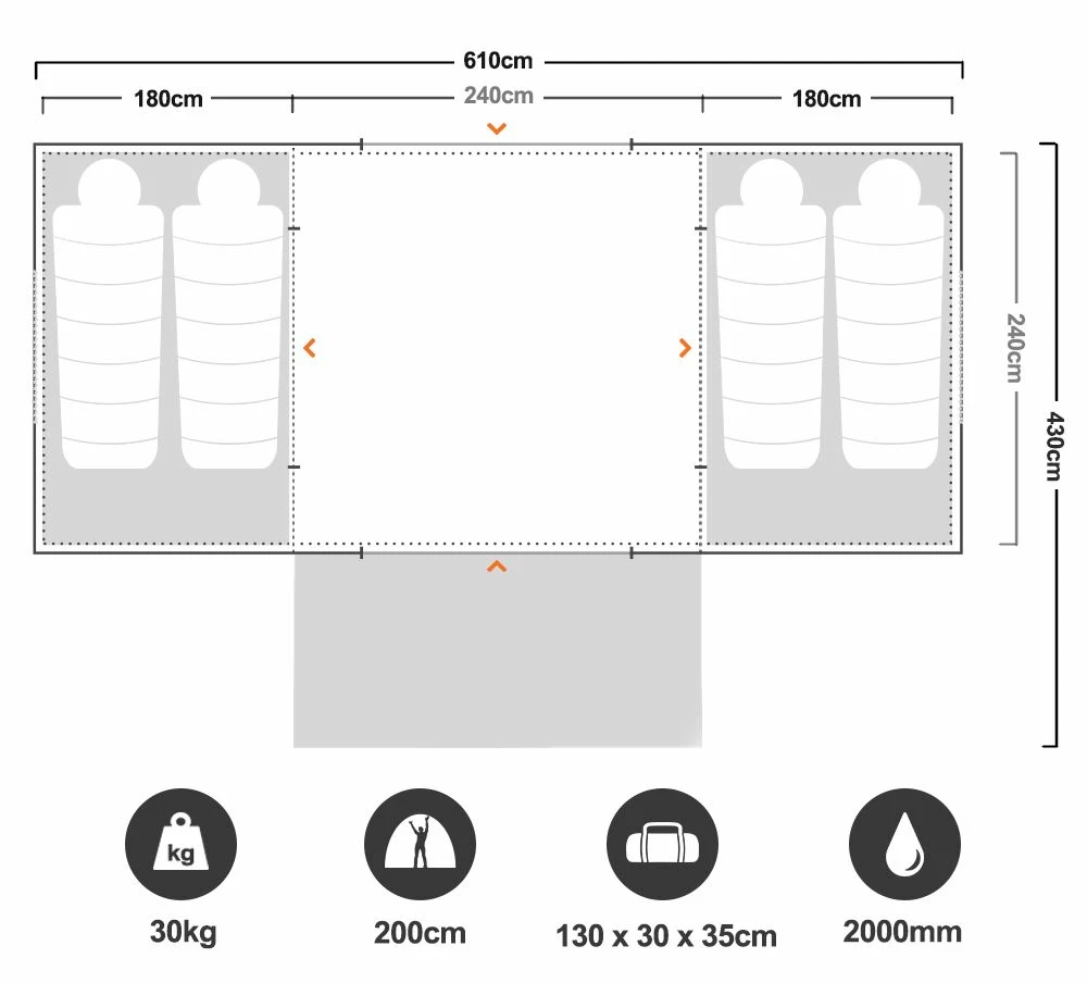 The three pole awning can be turned into an extended living area with optional panels, or it can be sectioned off with an optional screen room for a fully enclosed space. The added PVC storm flaps at the bottom of the optional front and side panels will help keep your awning dry in wet weather, and the zips and Velcro on the panels attach to the fly to allow for tape sealing for added water protection.